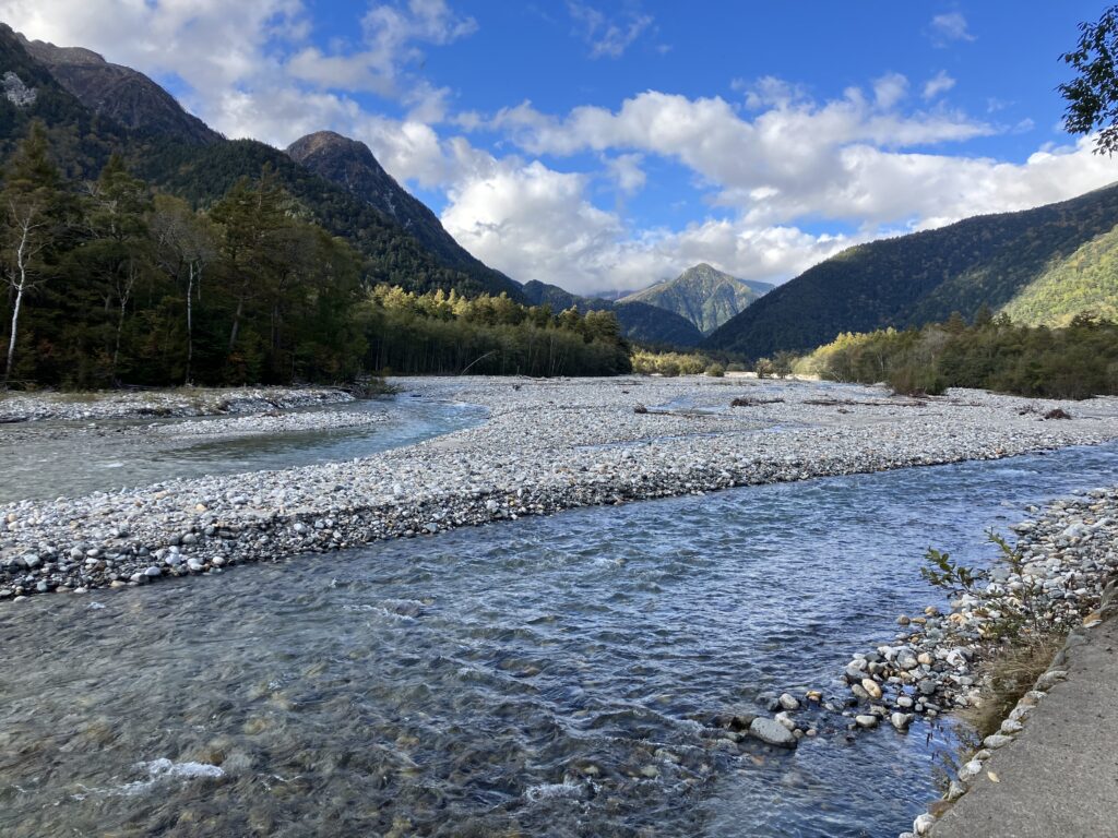 10月中旬。秋の上高地へ訪れた。今回は2度目の徳沢を目指す。初日は、上高地バスターミナル、河童橋から左岸ルートで明神館を経て、徳沢ロッヂへ宿泊。2日目は徳沢ロッヂから明神池を観光し、左岸ルートにて河童橋、上高地バスターミナルを目指す。早朝、関東の家を出発した際は小雨が降っていたが、松本に着くとすっかり止んで晴れていた。初日は雲は多かったが、一日中晴れの陽気だった。何より山の空気が心地よい。