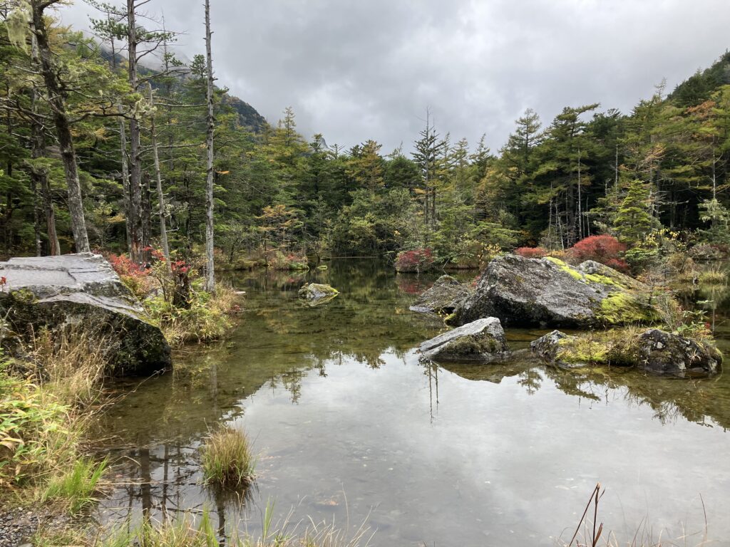 奇跡的に明神池をみている最中は雨は止んでいて、朝早いこともあり観光客はまだあまりいなかった。明神池二の池の奥まで進む場合は地面が湿っていて足場が悪かったため注意が必要だ。筆者はかなり慎重になり奥まで進んだ。