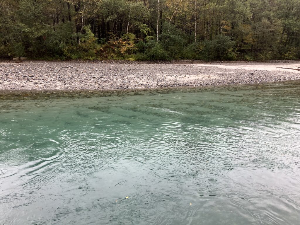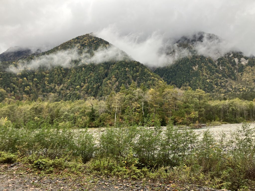 お昼ご飯のあとは、荷物を預け、周辺を散策する。バスターミナルから徒歩10分の距離にある上高地帝国ホテルのカフェでお茶をしたり、帰りは梓川沿いを歩きバスターミナルへ戻ってきた。梓川は、大雨にもかかわらず、晴れの日と同じエメラルドブルーの色を保っている。焼岳や穂高連邦に雲がかかかっているのは仕方ないが、この綺麗な梓川にみとれてしまう。しかし、ここまで長時間歩くと、登山靴は防水とはいえ、水が浸水してきていた。予定よりも早いバスで帰路につく。雨の分、正直疲れは多かったと思う。けれど大自然の中、雨に打たれながら歩くのもなかなか悪くはななかった。