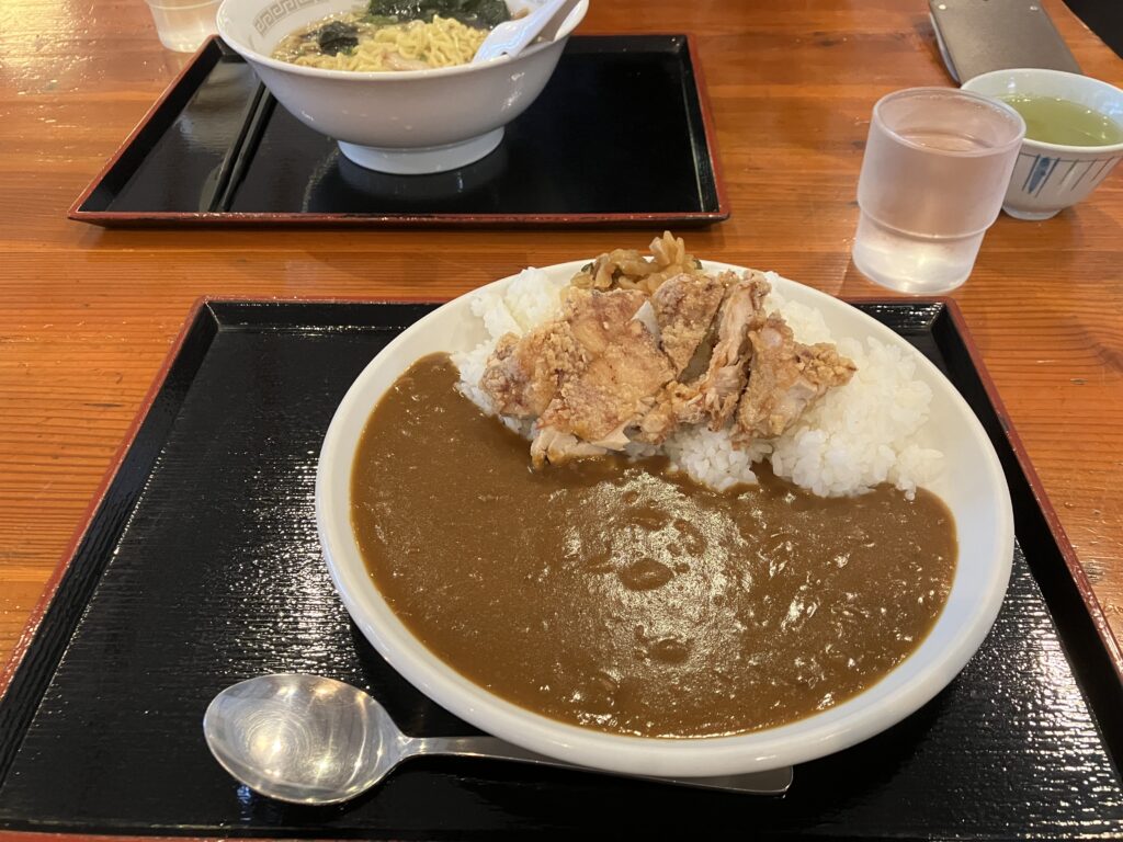 大雨の中、カッパと傘をさし上高地バスターミナルへ到着。1時間強ひたすら黙々と歩く。雨のせいもあり疲れ切っていたため、すぐにお昼ご飯を食べるために、お店に入る。入店したのはバスターミナル目の前にある上高地食堂。この地点で11時半だったが、なんとか1組待ちですぐにお店に入ることができた。店内に入る際は濡れたカッパは厳禁で、ストックも畳まなければならない。注文したのは、「山賊焼きのせカレー」「醤油ラーメン」だ。これを食べるためにここまで歩いてきたのだ!!というほど体に染みて、最高に美味しいご飯であった。