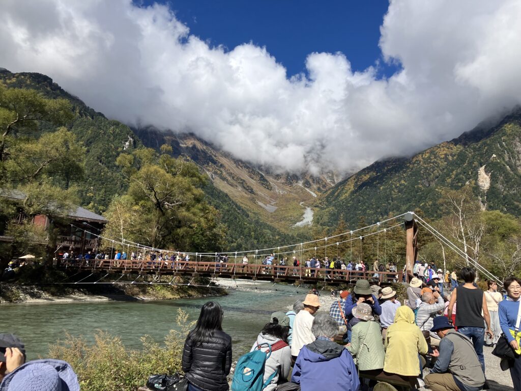 始発の特急あずさ(7:00新宿発)でアルピコ交通上高地線(電車)を経由して真っ直ぐ向かうと、上高地にはちょうど12:00に到着となる。上高地バスターミナルの駐車場には観光バスが20台近く止まっていた。(※一般車の乗り入れはできません)そして河童橋は多くの観光客で賑わっていた。