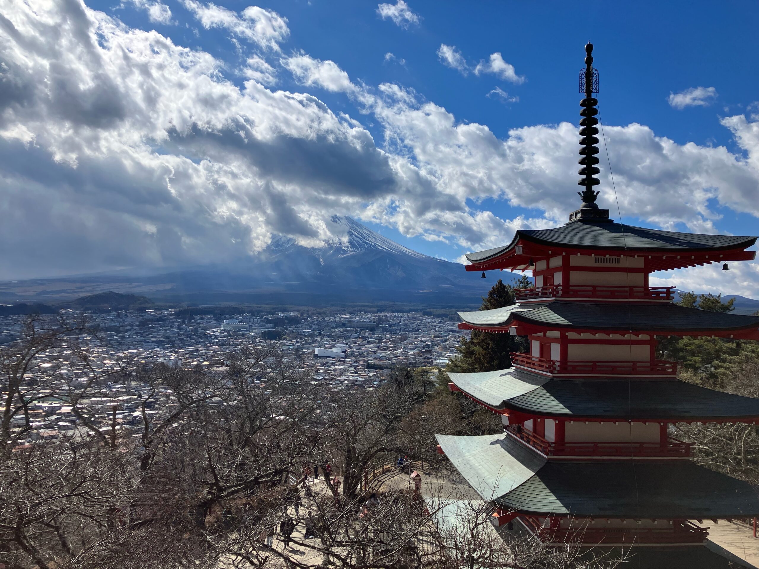 1月某日、山梨県富士吉田市にある新倉山(あらくらやま)浅間神社へ行ってきた。都心では連日スッキリしない曇り空が続いていたが、この日は晴れ間がみえ、冬らしい寒さを感じられる日だった。さて、新倉山浅間神社がある公園内の展望台からは、五重塔(慰霊塔)とともに、迫力のある富士山を望むことができる。この絵になる景色をみてみたい!ということで早朝に都心を出発し、3時間程度で富士急行線下吉田駅へやってきた。
