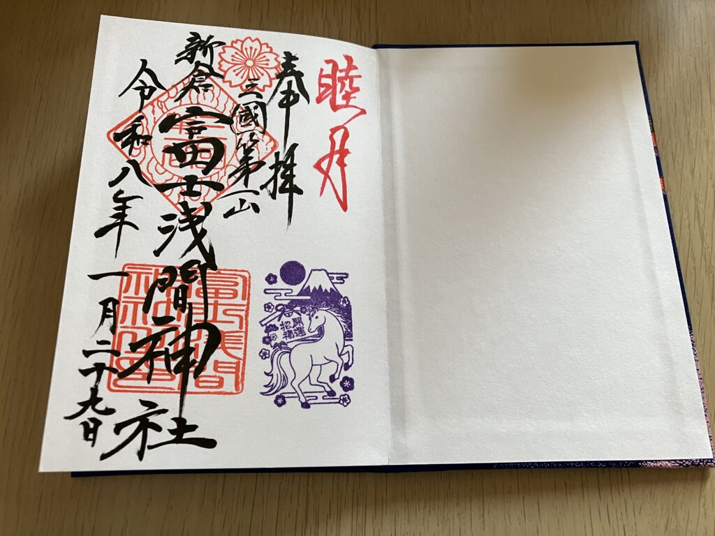 とても急な階段を登り、10メートルほど進む。鳥居をくぐるとすぐに新倉山浅間神社がみえてくる。展望台へ行く前にお参りをして御朱印を頂いた。富士山と五重塔デザインの御朱印帳が欲しかったため購入する。紺色地に鳥居、五重塔、富士山、舞っている桜のデザインが美しい。夜桜をイメージさせるデザインである。紺色の他、色違いで4種類のデザインがあった。
