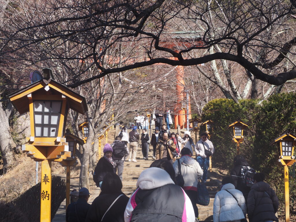 駅前は、インバウンドの外国人で賑わっている。周辺に観光バスが2台ほど。旗を持った添乗員が集団を率いている光景が広がっていた。駅舎を出て右方面に進んでいく。集団の流れについていくこと徒歩10分、神社の鳥居がみえてきた。マップをみなくても辿り着くことができた。